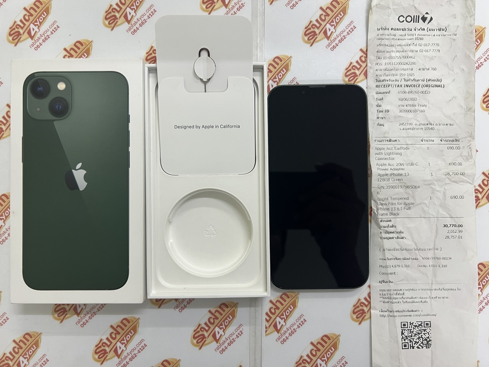 ขายถูก iPhone 13 128GB สภาพสวย92% สุขภาพแบต96% เครื่องสีเขียว เครื่องศูนย์ไทย อุปกรณ์มี ตัวเครื่อง+เข็ม+คู่มือ+กล่อง+ใบเสร็จ ประกันหมดแล้ว
