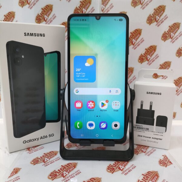 ประกาศขายโทรศัพท์มือถือสมาร์ทโฟนเป็นรุ่น Samsung Galaxy A06 5G Ram 6 GB Rom 128 GB จอ6.7นิ้ว สภาพ 98 % เครื่องสีดำ อุปกรณ์ กล่อง + สายชาร์จ ประกัน 31 ต.ค. 2026