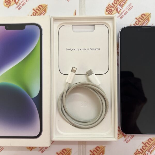ขายถูก iPhone 14 128GB สภาพสวย90% ขอบมีรอย1จุดเล็กๆมองแทบไม่เห็น สุขภาพแบต99% สีPurple อุปกรณ์ครบกล่อง(ขาดเข็ม)มี ตัวเครื่อง+สายชาร์จ+คู่มือ+กล่อง