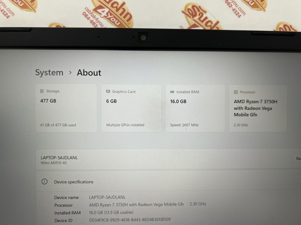 รายละเอียด | ประกาศขายโน๊ตบุ๊คเกมมิ่ง คีย์บอร์ดมีไฟ เป็นรุ่น ACER Nitro 5 AN515-43-R56M CPU AMD Ryzen 7 3750H/NVIDIA GeForce GTX 1650 4GB/RAM16GB/SSD512GB จอ15.6นิ้ว (1920×1080) Full HD คีบอร์ดมีไฟ เครื่องสีObsidian Black สภาพสวย92% อุปกรณ์มี ตัวเครื่อง+สายชาร์จ รีเซ็ตWindowsให้ใหม่แล้วพร้อมใช้งานได้ทันที ประกันหมดแล้วแต่ใช้งานได้100% |