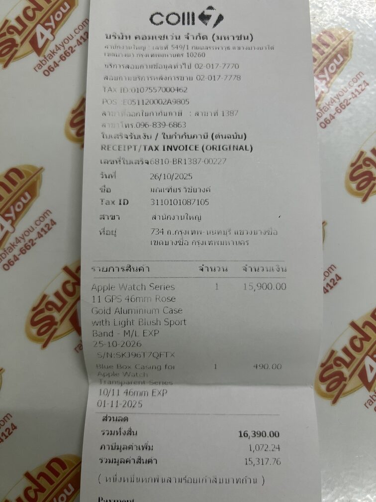 ประกาศขายนาฬิกาจากค่ายดังฝั่งAppleเป็นรุ่น Apple Watch Series 11 GPS อะลูมิเนียม 46 มม.(จอใหญ่) สีRose Gold สภาพสวย95% การันตีความใหม่ สุขภาพแบต100%(แทบไม่ได้ใช้งาน) เครื่องศูนย์ไทย อุปกรณ์ครบกล่องพร้อมใบเสร็จมี ตัวเรือน+สายนาฬิกา+สายชาร์จนาฬิกา+คู่มือ+กล่อง+ใบเสร็จ รีเซ็ตให้แล้วครับ ไม่ติดiCloud ประกันหมดวันที่ 25 ตุลาคม 2569