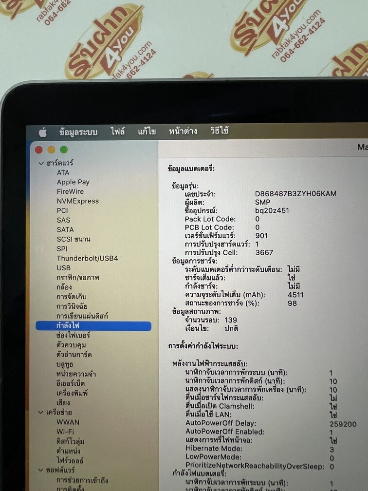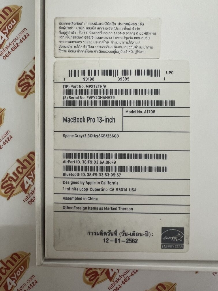 | รายละเอียด | ประกาศขาย Macbook ตัวPro ปี2017 มีทัศบาร์ จอ13.3นิ้ว รุ่น MacBook Pro (13-inch, 2017, Two Thunderbolt 3 Ports) CPU intel core i5 2.3GHz RAM8GB SSD256GB จอ13.3inch Retina(2560 x 1600) Cycle Count 139 สภาพสวย89% มีรอยนิดหน่อยโดยรวมแล้วสวย สีSpace Grey เครื่องศูนย์ไทย อุปกรณ์ครบกล่องมี ตัวเครื่อง+Adapter+สายชาร์จType C+คู่มือ+กล่อง Restoreเครื่องให้ใหม่แล้วพร้อมใช้งานได้ทันที ไม่ติดiCloud ประกันหมดแล้วแต่ใช้งานได้100% |